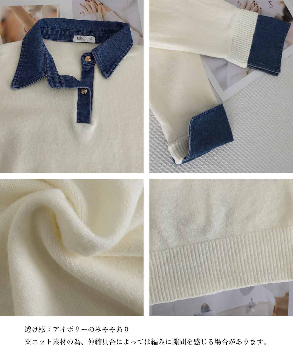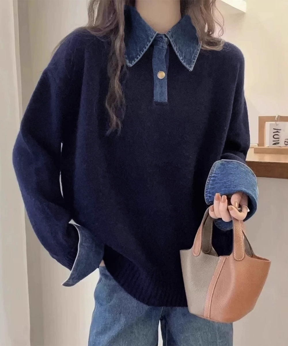 デニム素材の襟と袖口をドッキングした重ね着風ニットポロシャツ。