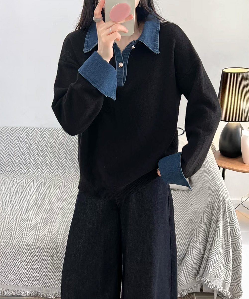 異素材ドッキングニットトップス 重ね着風 デニム衿ニットプルオーバー レディース おしゃれ 大人カジュアルニット 着やせ こなれ感ニット配色 韓国トレンド秋冬服 ゆるニット 細見え デニム素材の襟と袖をドッキングした、フェイクレイヤード風のニットトップス。 異素材の組み合わせがアクセントになり、立体感を生み出して1枚でスタイリングがまとまりやすいのも魅力。 ゆったりとしたシルエットで快適に着られ、カジュアルながら洒落感もしっかり演出。 デニムパンツはもちろん、スカートやワイドパンツとも相性が良く、デイリーからお出かけまで幅広く活躍するアイテム。 本体素材:ポリエステル80%+アクリル20% 別布素材:綿95%+ポリエステル5% カラー:ブラック/アイボリー/ベージュ/グレー/ネイビー/ワインレッド サイズ:ワンサイズ 着丈:約60cm 肩幅:約56cm 袖丈:約56cm ゆき:約84cm 身幅:約54cm 胸囲:約108-140cm 裏地:なし 伸縮性:あり 透け感:アイボリーのみややあり ※ニット素材の為、伸縮具合によっては編みに隙間を感じる場合があります。 生産国:中国 ※すべて平置きサイズです(採寸方法違いより、多少の誤差がございますので、ご了承ください)。 ※海外輸入品のため、商品の細部仕様は多少異なる場合がございます。予めご了承の上、ご注文お願い致します。