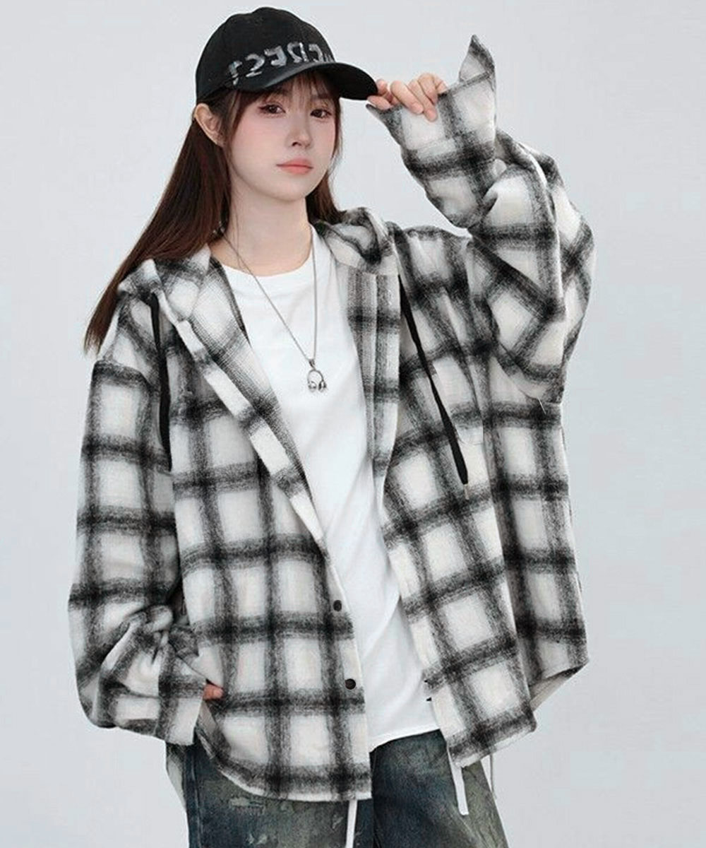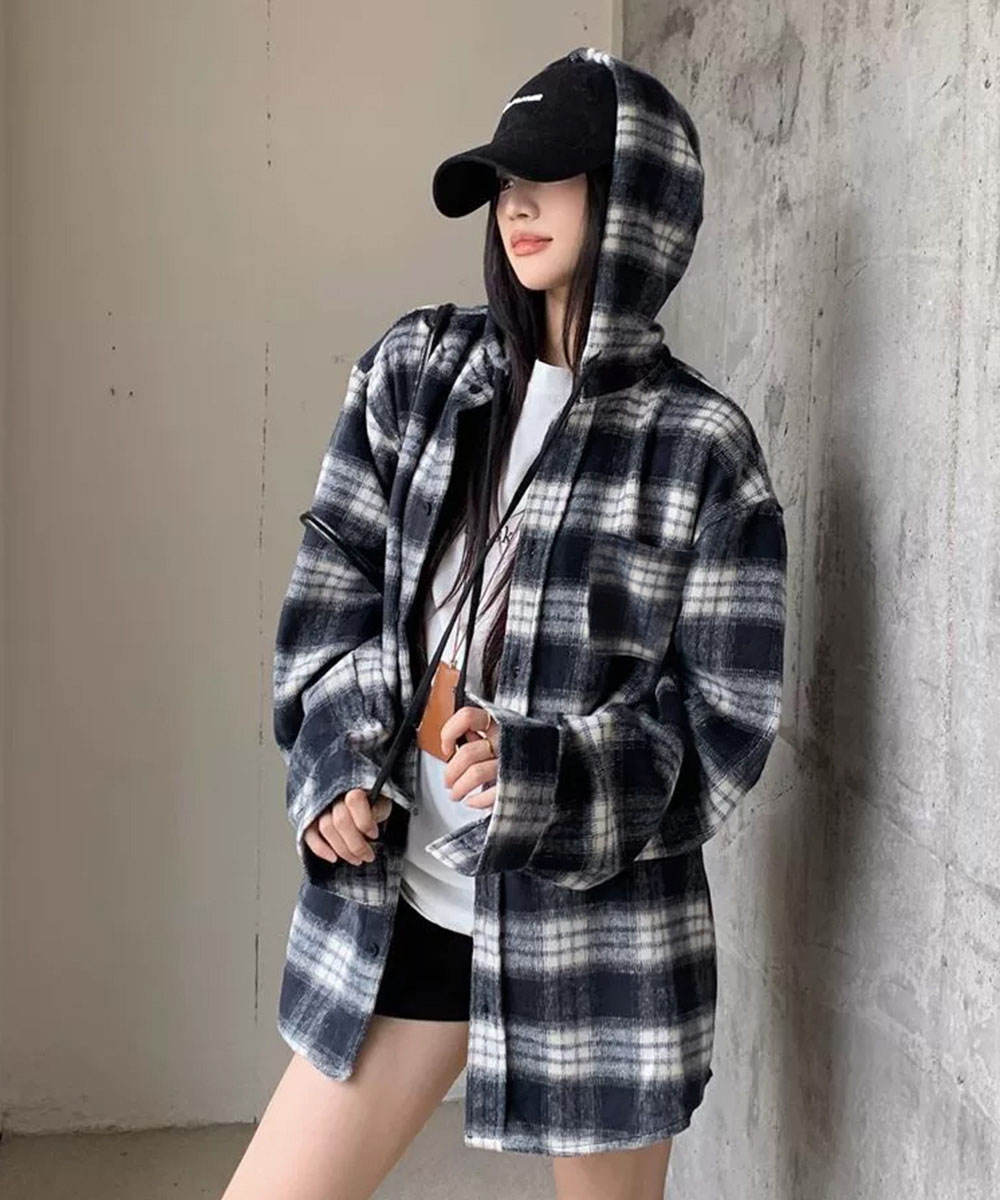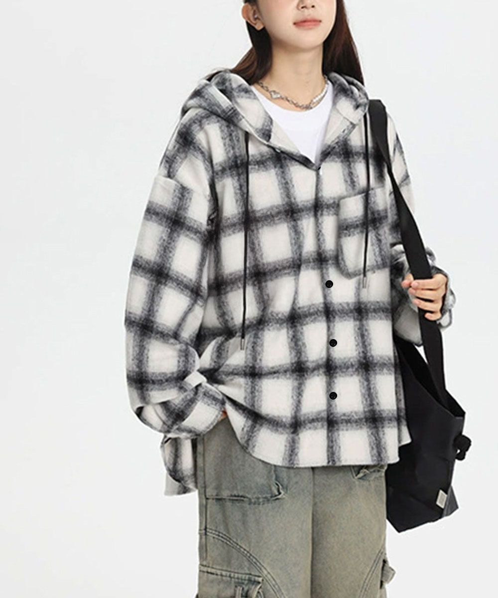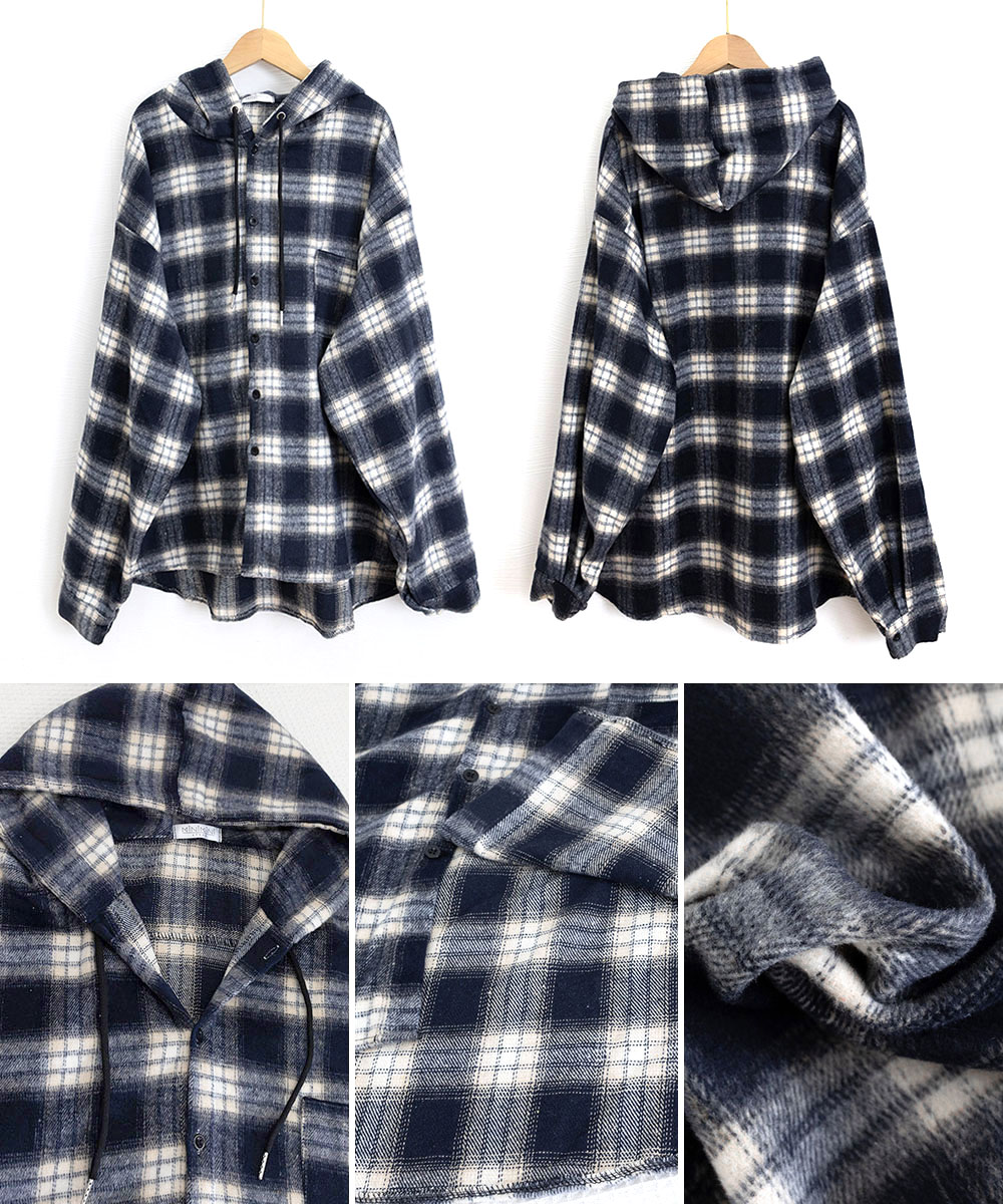 微起毛素材で肌触り抜群の大きめサイズのチェック柄フードシャツ。