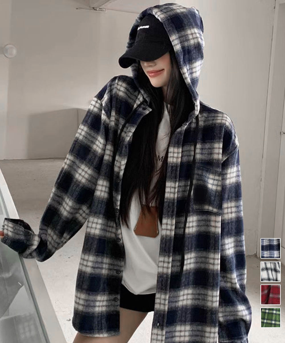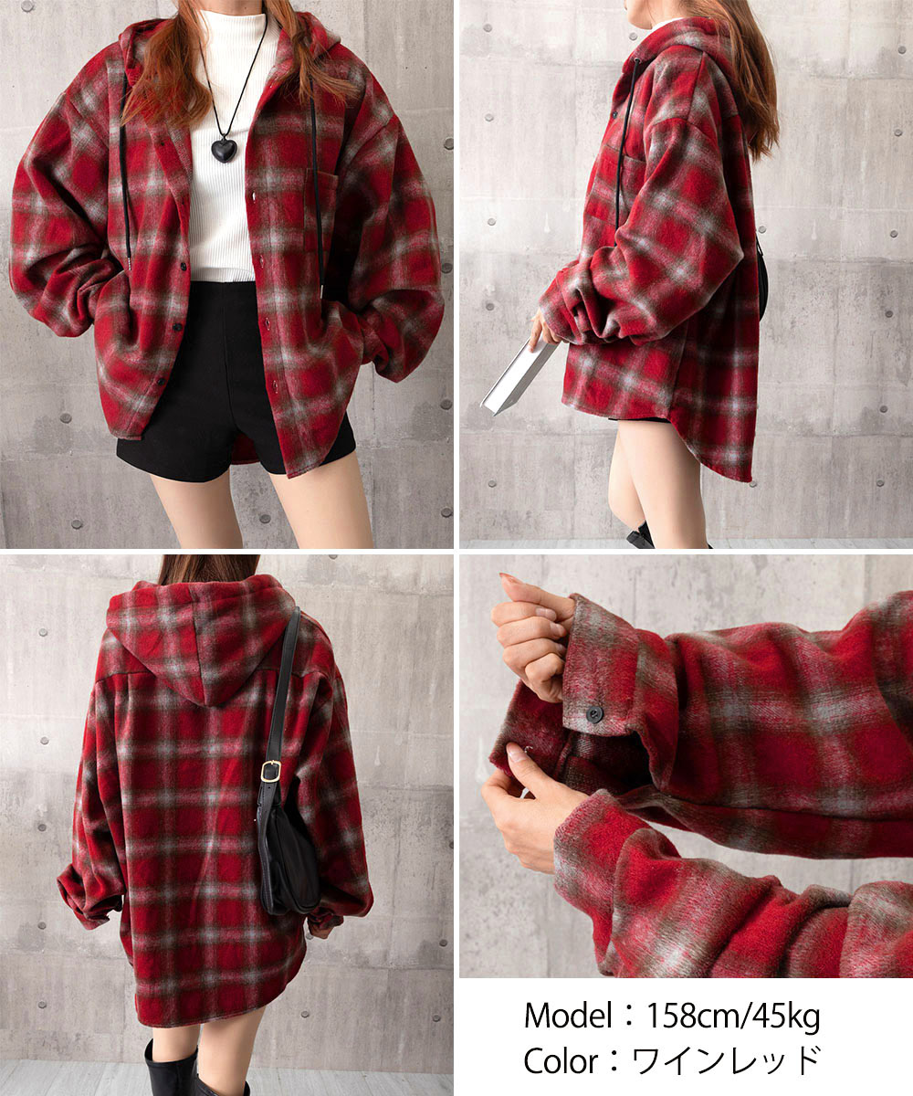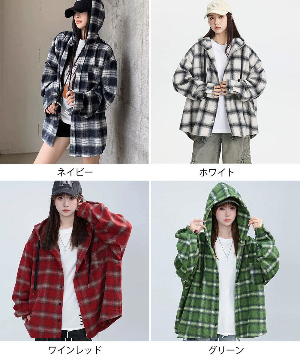 微起毛BIGフードシャツ オーバーサイズシャツジャケット ミディアム丈レトロチェックシャツ ゆったりこなれ感秋服アウター チェック柄羽織り秋 起毛シャツブラウス 春秋ライトアウター 大人気のチェックシャツにフード付きが登場! 微起毛素材で肌触り抜群、オーバーサイズで今っぽいシルエット。 程よい厚みで春秋の羽織りに最適、フードデザインがカジュアルなこなれ感をプラス。 アウターとレイヤードでフードを見せたり、ニットやトレーナーとの重ね着でコーディネートのアクセントに。 馴染みの良いオンブレーチェックで、ワイドパンツやレーススカートなど幅広いスタイルに合わせやすい。 br>素材:ポリエステル65%+綿35% カラー:ネイビー/ホワイト/ワインレッド/グリーン サイズ:ワンサイズ 着丈:前丈約71cm/後ろ丈約76cm 肩幅:約60cm 袖丈:約59cm ゆき:約89cm 身幅:約75cm 胸囲:約150cm 裏地:なし 伸縮性:なし 透け感:なし 生産国:中国 ※すべて平置きサイズです(採寸方法違いより、多少の誤差がございますので、ご了承ください)。 ※海外輸入品のため、商品の細部仕様は多少異なる場合がございます。予めご了承の上、ご注文お願い致します。