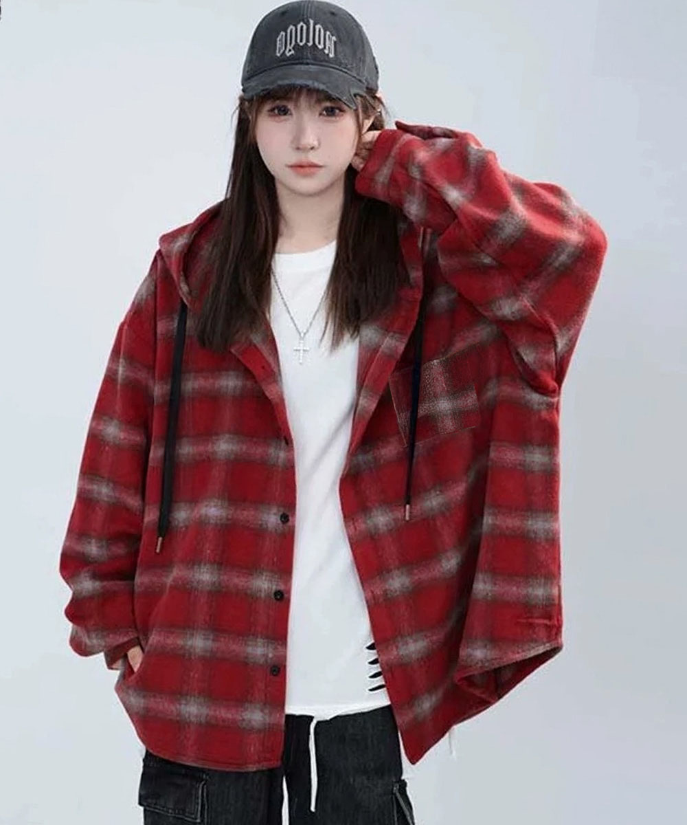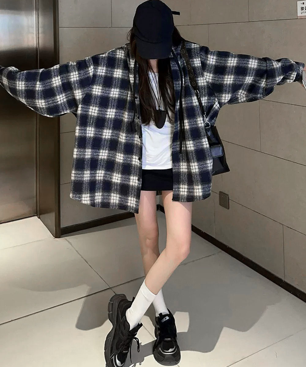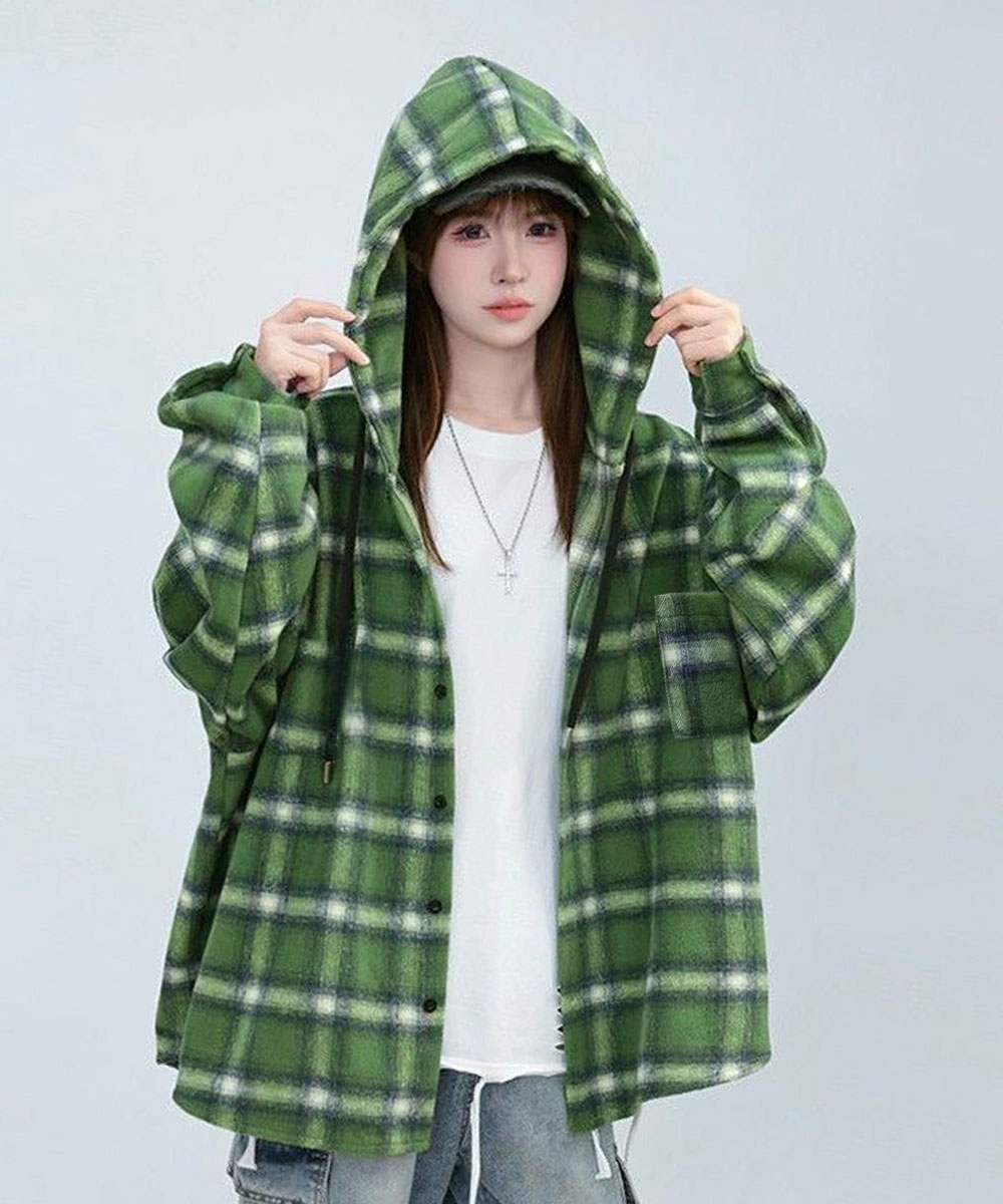 微起毛BIGフードシャツ オーバーサイズシャツジャケット ミディアム丈レトロチェックシャツ ゆったりこなれ感秋服アウター チェック柄羽織り秋 起毛シャツブラウス 春秋ライトアウター 大人気のチェックシャツにフード付きが登場! 微起毛素材で肌触り抜群、オーバーサイズで今っぽいシルエット。 程よい厚みで春秋の羽織りに最適、フードデザインがカジュアルなこなれ感をプラス。 アウターとレイヤードでフードを見せたり、ニットやトレーナーとの重ね着でコーディネートのアクセントに。 馴染みの良いオンブレーチェックで、ワイドパンツやレーススカートなど幅広いスタイルに合わせやすい。 br>素材:ポリエステル65%+綿35% カラー:ネイビー/ホワイト/ワインレッド/グリーン サイズ:ワンサイズ 着丈:前丈約71cm/後ろ丈約76cm 肩幅:約60cm 袖丈:約59cm ゆき:約89cm 身幅:約75cm 胸囲:約150cm 裏地:なし 伸縮性:なし 透け感:なし 生産国:中国 ※すべて平置きサイズです(採寸方法違いより、多少の誤差がございますので、ご了承ください)。 ※海外輸入品のため、商品の細部仕様は多少異なる場合がございます。予めご了承の上、ご注文お願い致します。