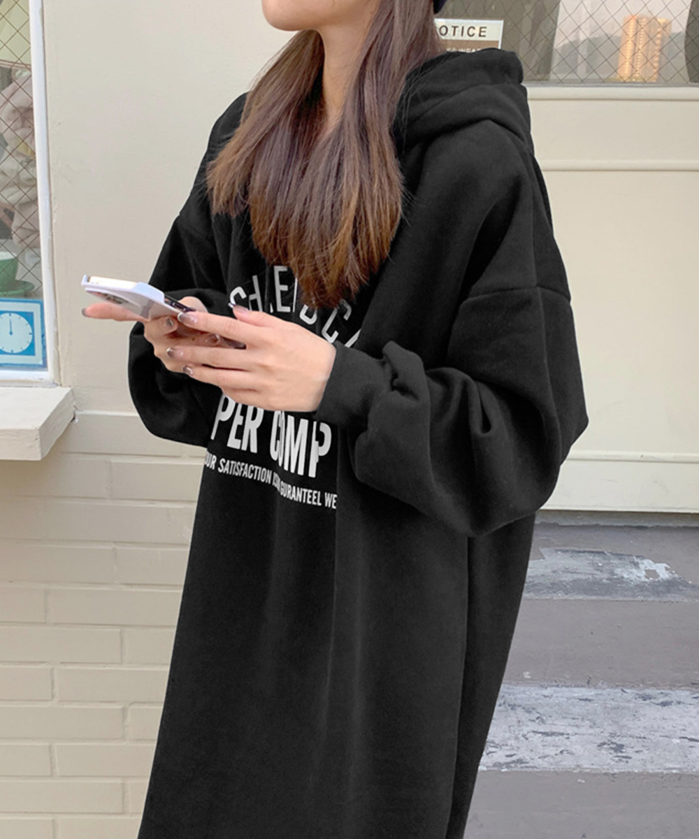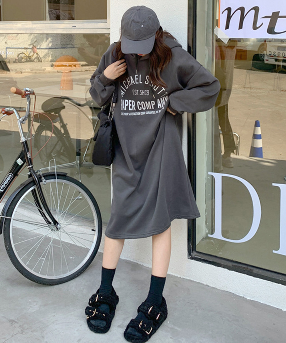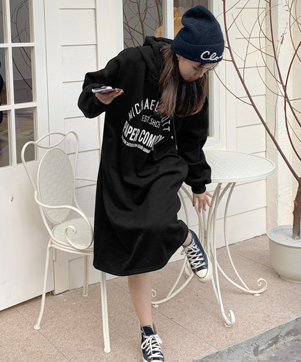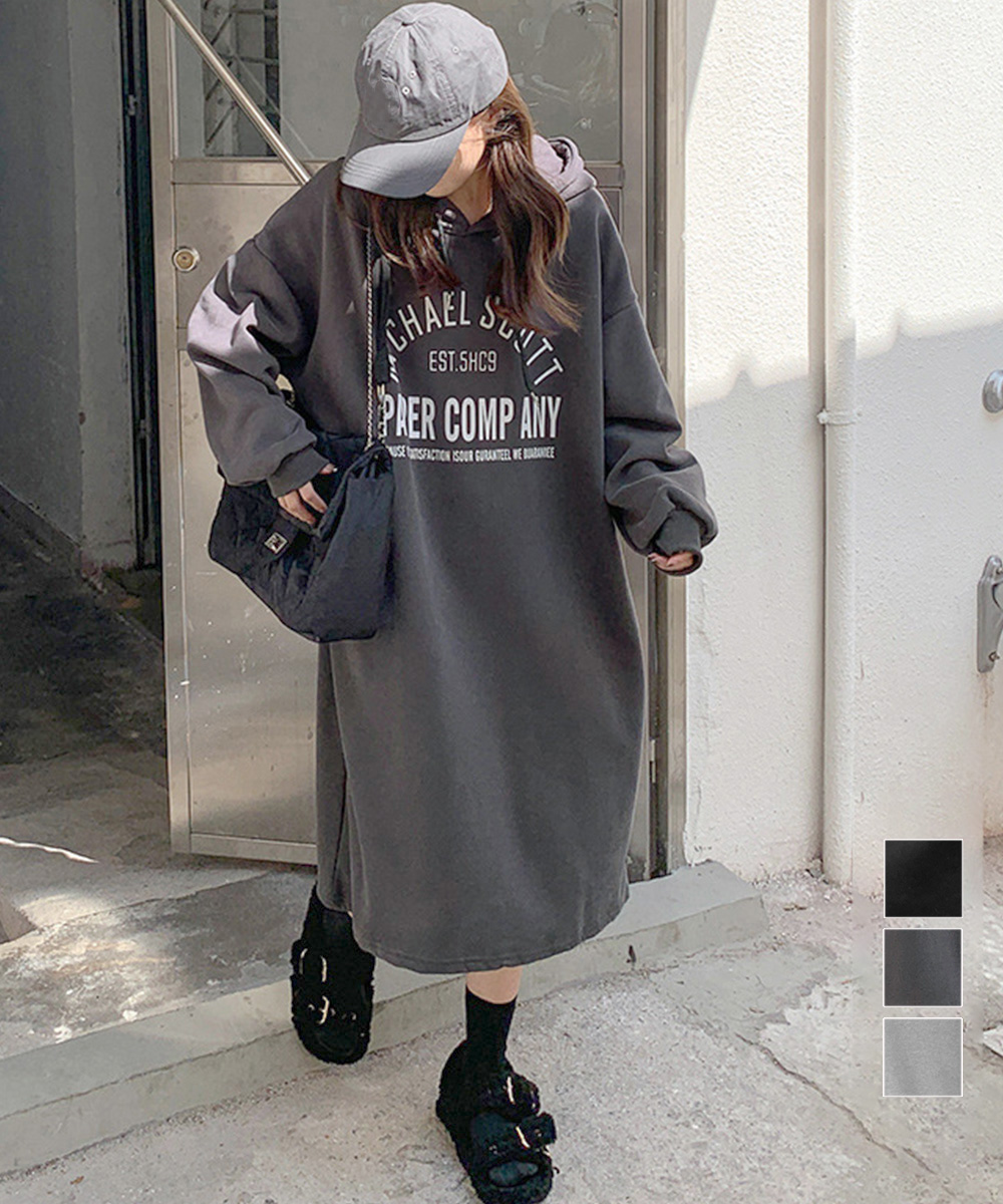 体型カバー ロゴプリント ゆるパーカーワンピース オーバーサイズ 厚手ワンピ 大人カジュアル ゆったりワンピース 着やせ 暖かいワンピ 無地 トレーナーワンピ秋 フードワンピース冬 フロントにロゴプリントが入ったオーバーサイズのスウェットワンピース。 裏地が起毛仕様になっているので、暖かく秋冬シーズンに最適な一着。 ゆったりとしたシルエットで体型カバーもでき、リラックス感のある着心地を実現。 キャップやミニショルダーバッグ、ブーツを合わせてストリートカジュアルなスタイリングが楽しめる。 素材:ポリエステル65%+綿35% カラー:ブラック/ダークグレー/ライトグレー サイズ:ワンサイズ 総丈:約110cm 肩幅:約62cm 袖丈:約52cm ゆき:約83cm 身幅:約57cm 胸囲:約114-124cm 裏地:なし(裏起毛) 伸縮性:ややあり 透け感:なし