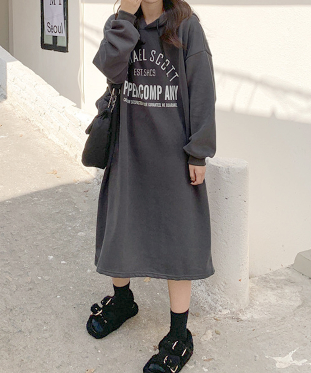 大きめサイズでゆったり着られる裏起毛のフードワンピース。