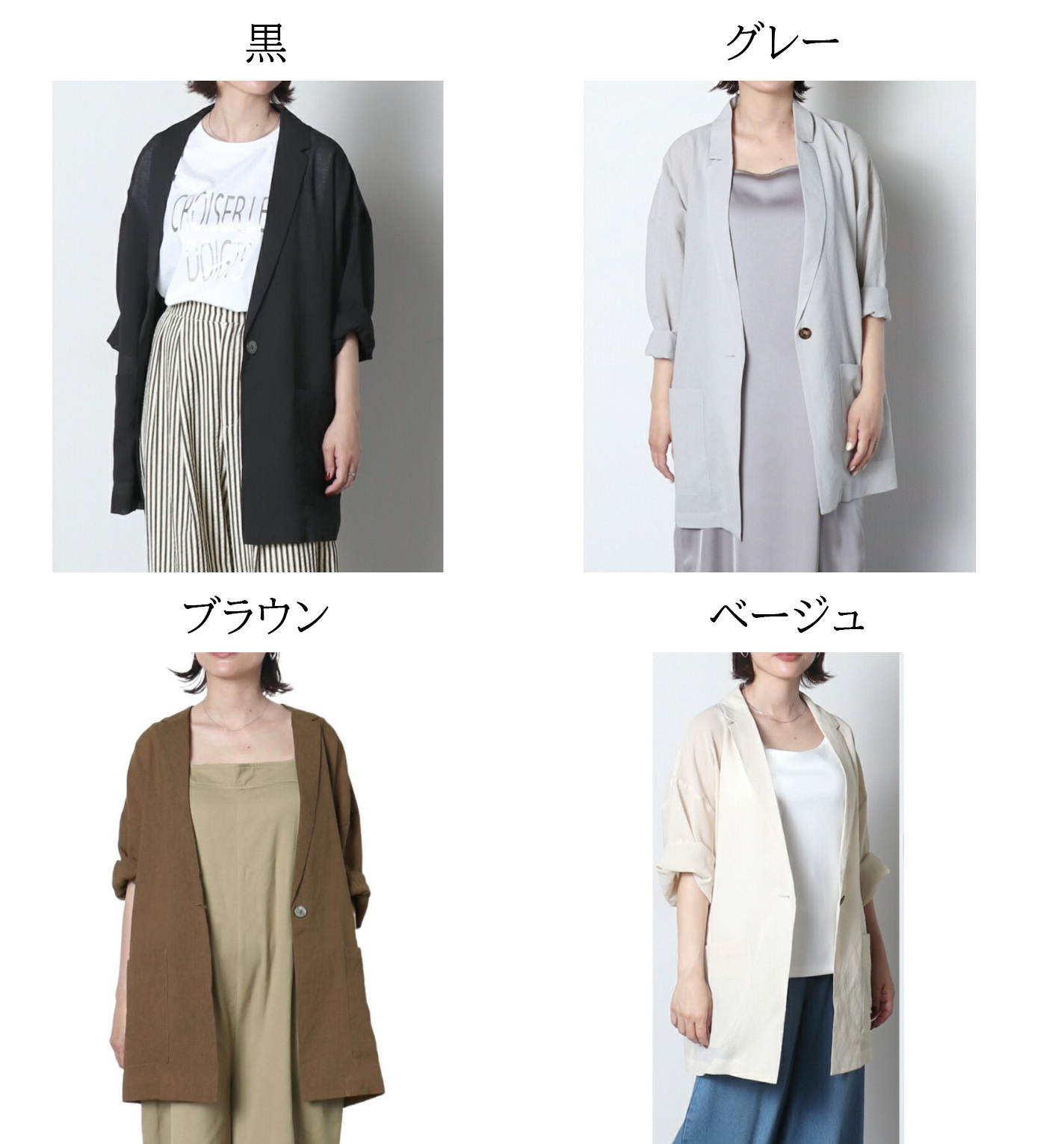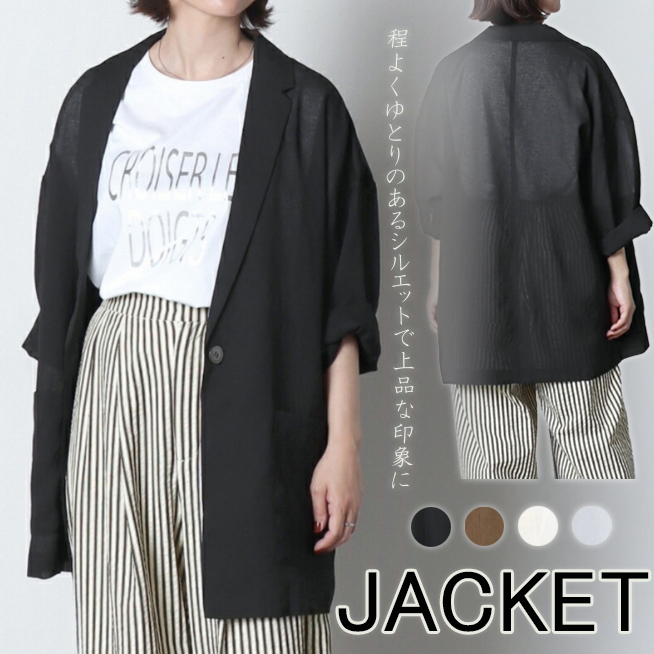 ■コメント 程よくゆとりのあるシルエットで上品な印象に。 。 大きめのポケットデザインポイント。 今期注目のオーバーサイズのジャケット。 日常、通勤通学などで活用できる便利アイテム。 まだまだ暑いこの時期、日焼け対策VS冷房対策としてもおすすめ。 ジーンズ、スカート、ショートパンツ、ワンピース色んな組み合わせが楽しめる。 ■サイズ(単位:約cm) ワンサイズ:着丈:58cm、袖幅:29cm、肩幅:60cm、袖丈:37cm(OK) ■カラー 画像に記載 ■伸縮性 なし ■裏地 なし ■生地の厚さ 普通 ■透け感 ややあり ■素材 ポリエステル ■重量 ■包装状況 OPP袋