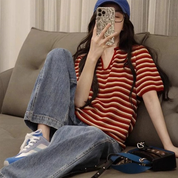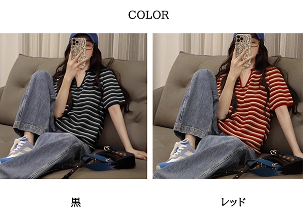 ■コメント ・伸縮性のある薄手の襟付きボーダーニット。 ・ボーダー柄が爽やかで可愛いです。 ・お顔回りがシャープに見えるVネックデザイン。 ・ヒップラインが隠れる着丈のオーバーサイズでさまざまなボトムスと相性がいいです。 ■サイズ(単位:約cm) フリーサイズ 着丈54 バスト94 肩幅32 袖丈cm21(OK) ※平置き採寸の為、1-3cmの誤差がある場合があります。予めご了承下さいませ。 ■カラー 画像に記載 ■裏地 なし ■生地の厚さ 普通 ■透け感 なし ■伸縮性 あり ■素材 レーヨン100%