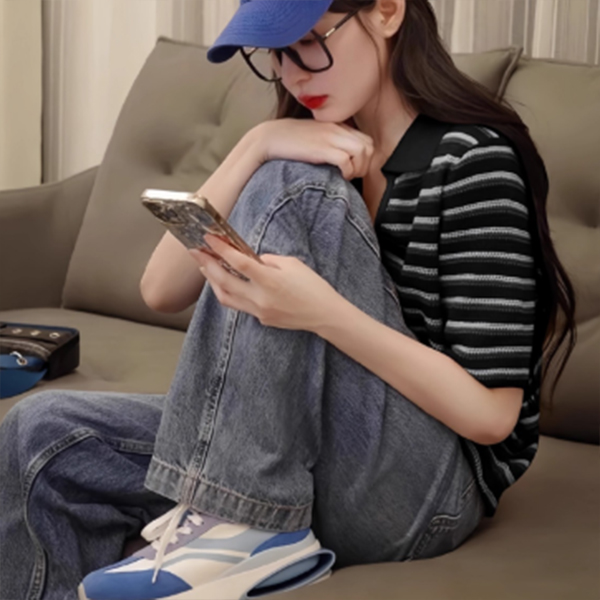 お顔回りがシャープに見える深めの襟がポイントのボーダーニットです。